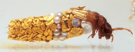 That’s where Hubert Duprat comes in. The artist knew caddisflies were adaptable and that if exposed to materials other than the usual ones, they’d incorporate them into their cases. So in the 1980s, he isolated some larvae, gently removed their natural sheaths, and put the insects in an aquarium with gold flakes, eventually adding coral, turquoise, pearls, rubies, sapphires and diamonds. The results were stunning.