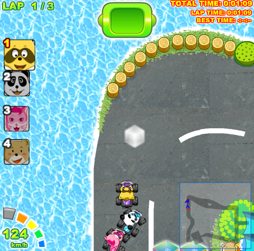 Instructions for Racing Online: Please allow 30 seconds for game to load. In this racing game you’ll play the part of a Raccoon battling other raccoons for victory. This game is similar to Mario Cart in the game play and in that you’re racing in a cart. Try to hug the inside of the track on turns and avoid the other carts as well as the off road parts. To make your car go forward, press the up arrow on your keyboard (basically, it’s the gas pedal). To steer left, hold the left arrow key and to turn right, hold the right arrow key. If for some reason you need to reverse your car, use the down arrow key. Hang in there and the best you can because unlike other racing online games, the points roll over to the next race and help you win overall. For another car racing game set up like a Nascar Race, click here.